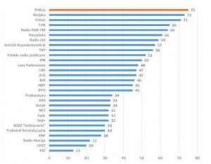 - Rekordowe poparcie dla działań Policji Z ostatniej edycji cyklicznego badania CBOS wynika, że Policja jest najwyżej ocenianą instytucją publiczną spośród wszystkich poddanych ocenie respondentów. Aż 75 procent ankietowanych dobrze ocenia działania Policji. Jest ona oceniana wyżej m. in. od poszczególnych stacji telewizyjnych, a ponad dwukrotnie lepiej od sądów.